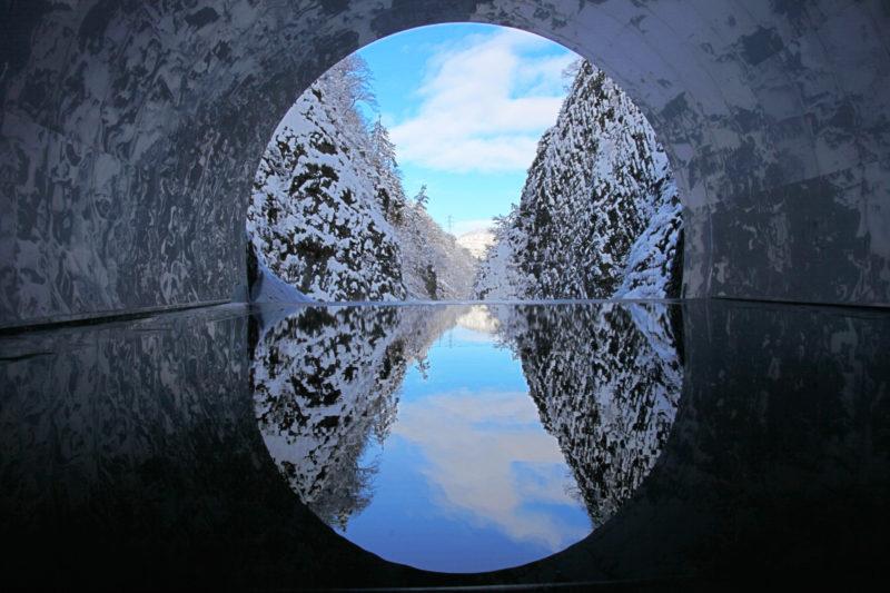 トンネル一番奥のパノラマステーションに構えるのが、建築家マ・ヤンソン率いるマッド・アーキテクツが仕掛けるインスタレーション<ライトケーブ>。天井にはステンレス板が貼られ、床に張られた渓谷の水が、雪景色の清津峡の自然美をまるで鏡のように反射し、丸いトンネルを作り上げています。