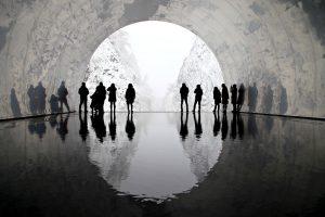改修の目玉は、パノラマステーション。床に水を張り、トンネルの壁にステンレス板を貼った。外の景色がトンネルの内部に映り、幻想的な雰囲気を醸し出しています。