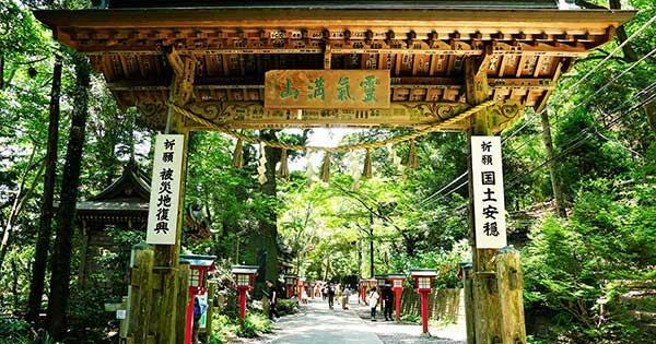 男坂・女坂を上がれば、まもなく薬王院の山門に着く。1200年以上前に開山された薬王院の境内にはたくさんの天狗の像が見られる。<ご利益スポット・パワースポット>