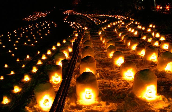 1番の見どころはかまくらのライトアップ!数100個のミニかまくらにろうそくの灯がともされ幻想的な世界が広がります!「死ぬまでに一度は見たい絶景」にも選ばれています。