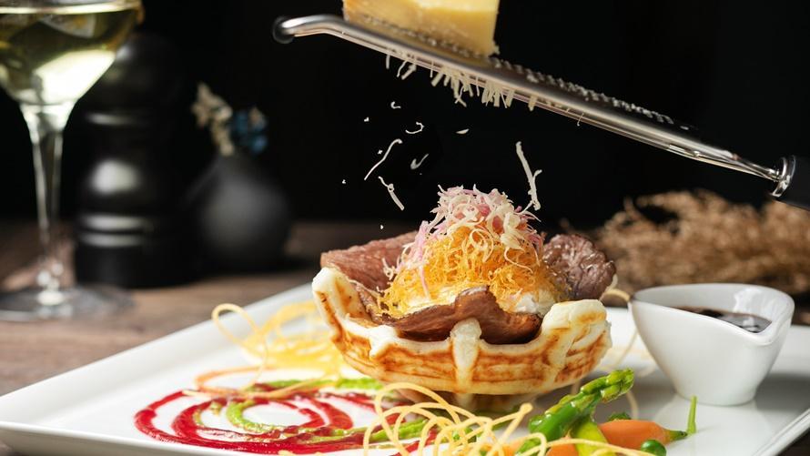 和洋中の食巡りも満喫できる1日限りの絶景旅。窓一面に広がる初夏の海を眺めながら、優雅なランチタイムをお楽しみください♪メインデッシュ【しらすの米粉ワッフル 葉山牛のすき焼き風】