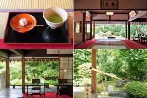 ●喜泉庵から眺める枯山水庭園。庭園を望む大広間で抹茶を味わえます。落ち着いた雰囲気が非日常体験を演出します。