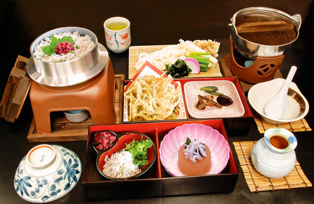まずは伊豆にて名物のしらす釜まぶし御膳の昼食。マスクメロンのご試食(1/16カット)もご用意しました。