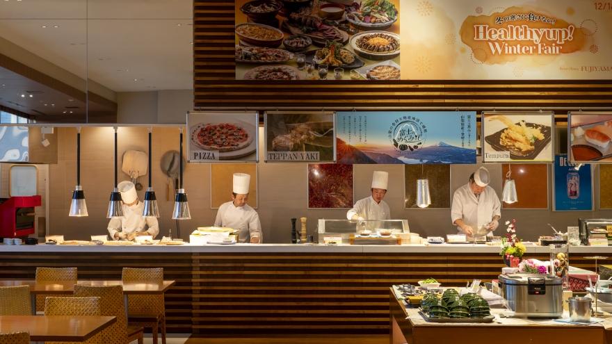 ライブキッチンで調理する出来立ての料理や富士山周辺で採れた新鮮素材や旬の食材を取り入れた80種類以上のメニューからなる大人気のビュッフェをお楽しみください!