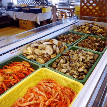 サザエ・ホタテ・カキなどの貝類やエビ、金谷名物のアジフライなどの揚げ物、たくさんのお惣菜、自分で作る海鮮丼やシーフードラーメンもあります。海鮮が苦手な方でもお肉、カレー、デザートまで食べ放題が勢揃い!