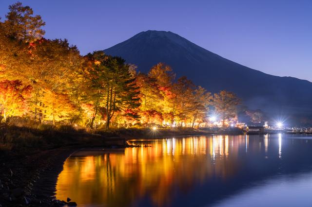 太陽が富士山越しに西に沈むと、湖畔の紅葉が一斉にライトアップします!