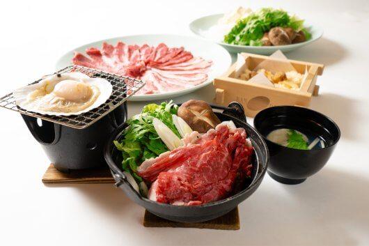 【お品書き】栃木ブランド牛すき鍋<おかわり自由>、ホタテの炊き込みご飯、ホタテの網焼き、ホタテのお吸い物