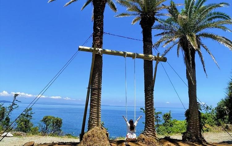 アジアンガーデン内にある「空と海とブランコ」!美しい海の背景とリゾート感満点なヤシの木ブランコの組み合わせはまさにインスタ映えそのもの!