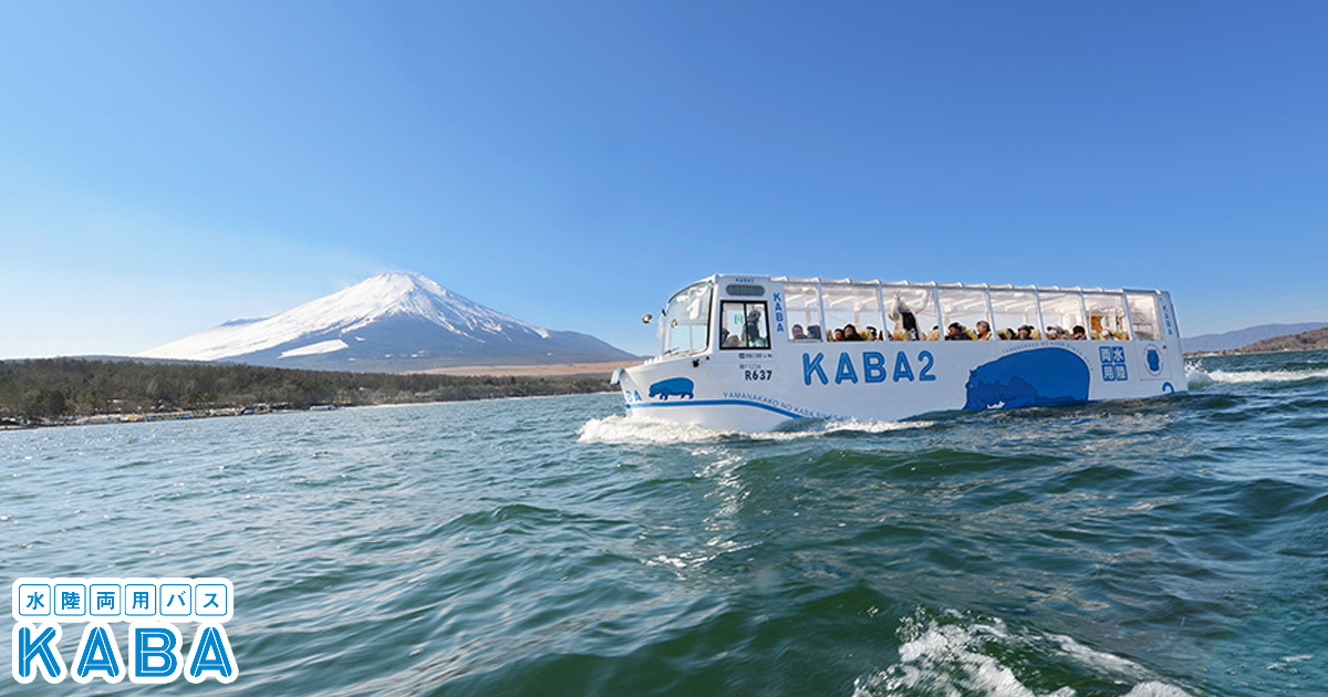 「KABAバス」は、陸地と水上を行き来できる水陸両用車。山中湖周辺の景色を陸上で楽しんだ後、水面へスプラッシュイン!まるで船旅のような感覚で湖上からの絶景も満喫!
