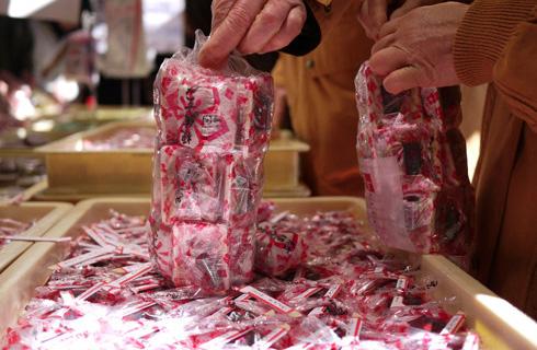 食後は、ふるさとの味をコンセプトに手作りの味にこだわる『桔梗信玄餅』工場併設の「グリーンアウトレット1/2」で実施している、売り切れ御免の人気の詰め放題を今回はツアー用に確保!桔梗信玄餅を限界まで詰め放題にチャレンジ!