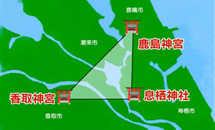江戸時代にお伊勢参りに次いで広く親しまれていたもので香取神宮・鹿島神宮・息栖神社の茨城県と千葉県にまたがる三つの神社を巡ることを言います。それぞれのパワースポットを線で結ぶと直角二等辺三角形ができ、その中では不思議なことが起こるといううわさもあるようです。