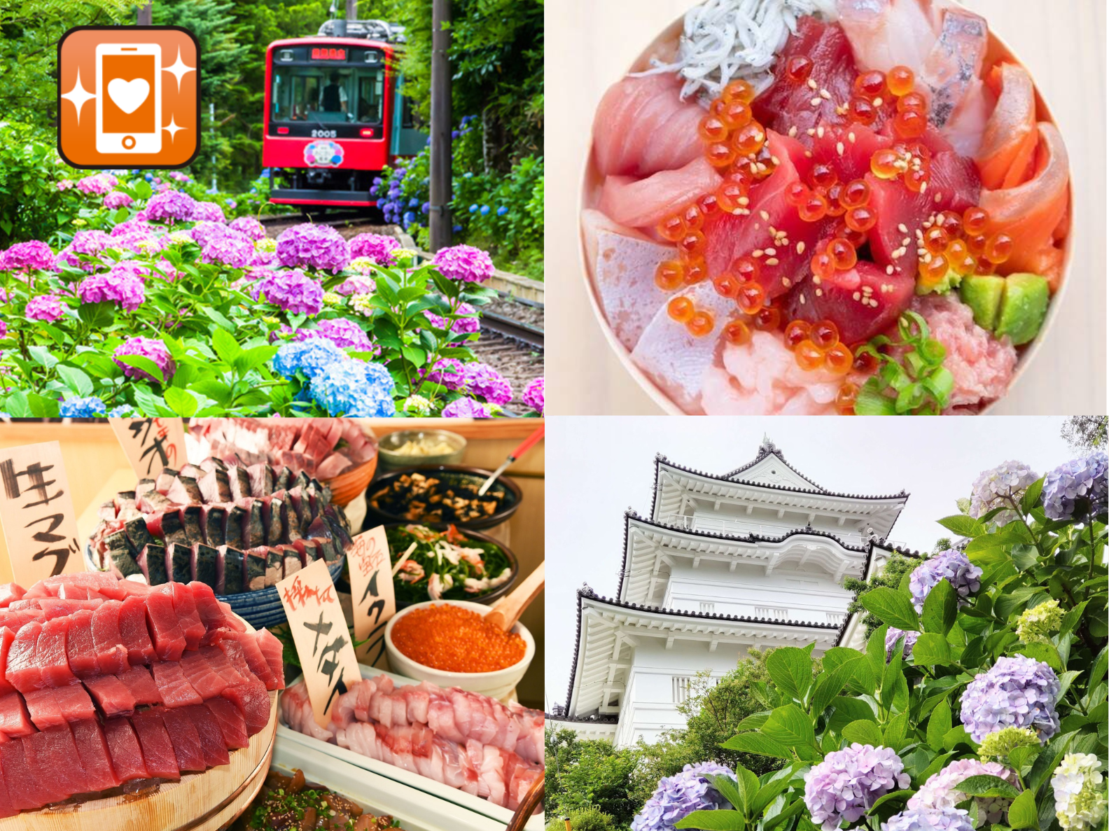 箱根の梅雨を美しく染める風物詩♪箱根あじさい電車と初夏を彩る「小田原城址公園」&小田原港直送!お刺身天国海鮮食べ放題(約30種類の海鮮)