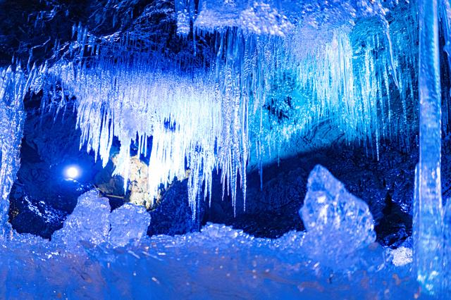 国の天然記念物に指定された洞窟をライトアップされた氷柱が彩ります。