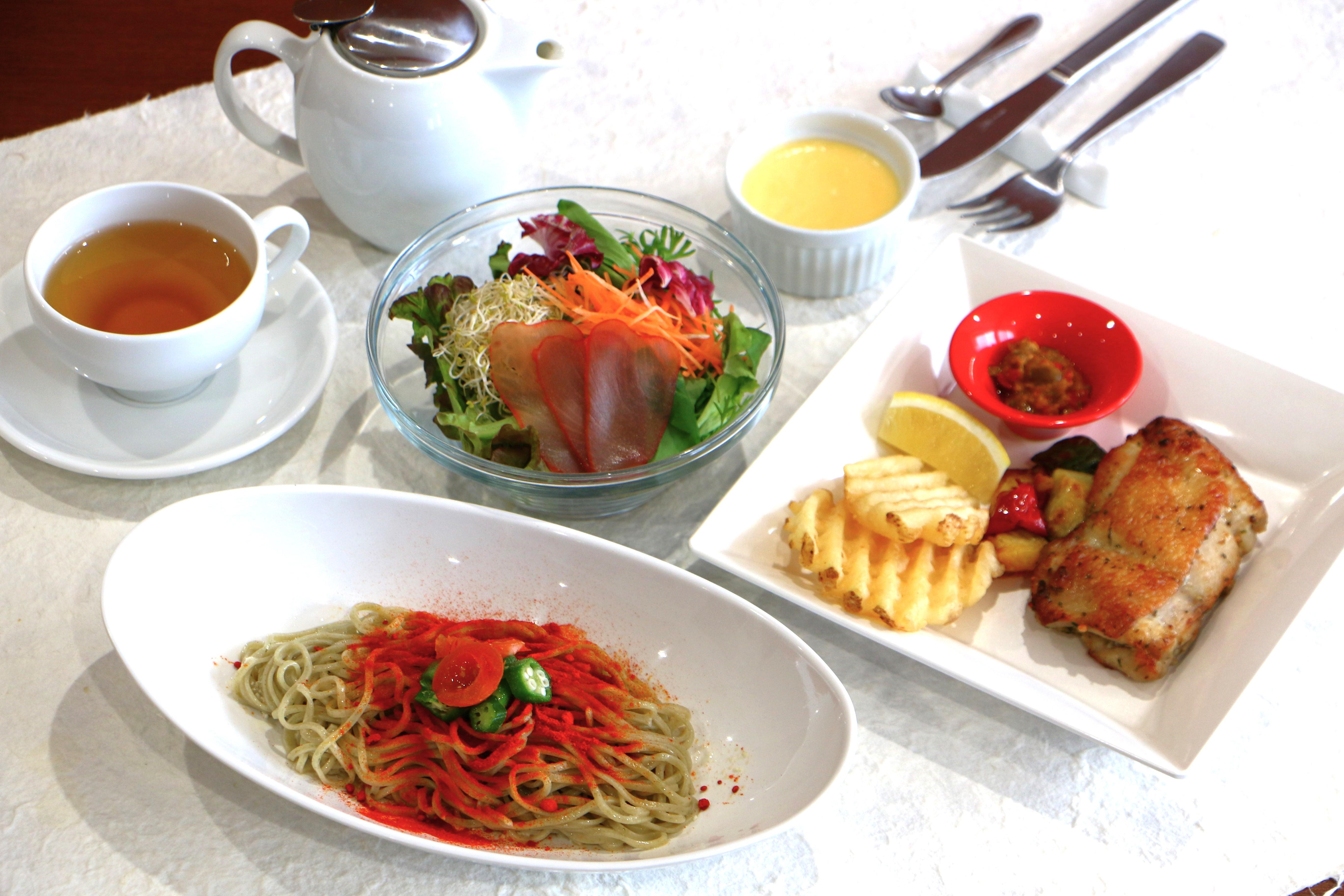 ●レストラン「魚沼スイーツガーデン ナトゥーラ」でランチタイム。地元食材にこだわったへぎそばイタリアンをお召しあがりいただきます。