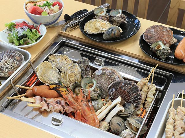 店内にずらりと並ぶ炭火台で、カキ・サザエ・ホタテ・ハマグリ・ホンビノスなどの新鮮な魚介や、肉・野菜・ご飯ものまでが食べ放題。