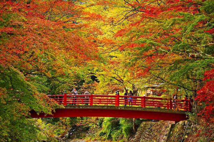 晴れた日には鮮やかに染まる楓と富士山を見ることができます。赤から黄色と色合いを変えながら頭上を彩る紅葉は圧巻の美しさです。