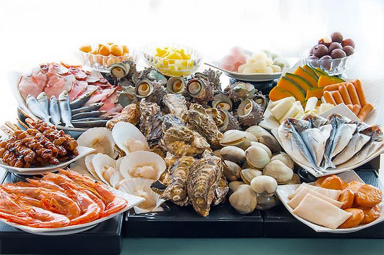サザエ・ホタテ・カキなどの新鮮な貝類を豪快に焼いて味わう海鮮浜焼き食べ放題!