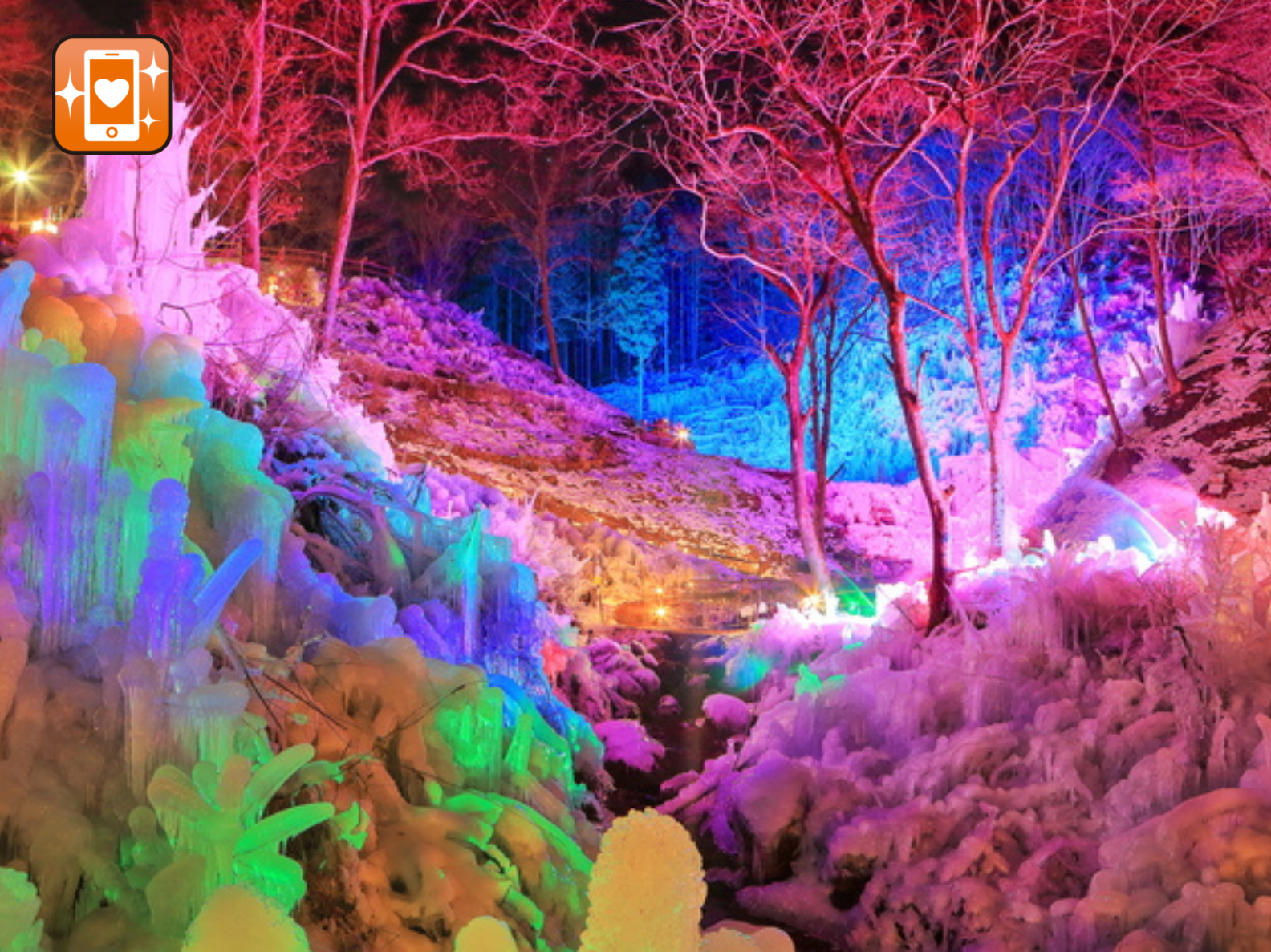●夜空に映える幻想「あしがくぼの氷柱」ライトアップ!氷の造形美 × カラフルなライトが織りなす光景はまさに“氷の芸術”。