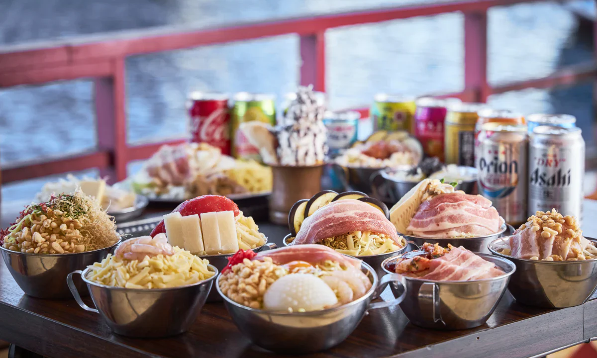 【ハピ旅/アプリ対象ツアー】<完全貸切屋台船>もんじゃ食べ放題&飲み放題&大人気!国産牛ステーキ100gサービス~