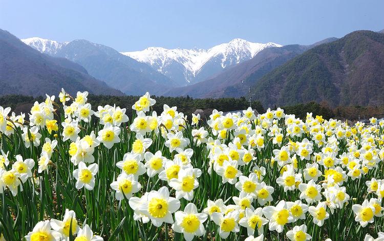 約20万株の黄色い水仙と、残雪輝く中央アルプスのコントラスト!