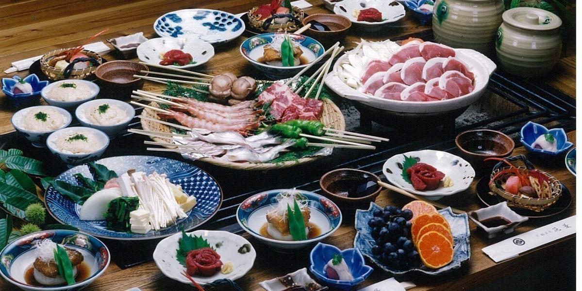 ◎夕食は新鮮な山の幸をアツアツの囲炉裏料理にて。料理長が地元出身ということもあり、厳選された山の味覚を堪能できます。