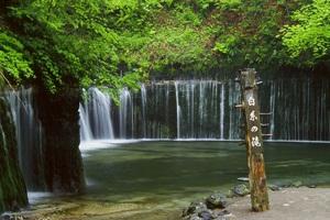 湯川の源流になっている滝で、湾曲した岩壁に数百条の地下水が白糸のように落ち、清涼感に包まれる。紅葉も素晴らしい。