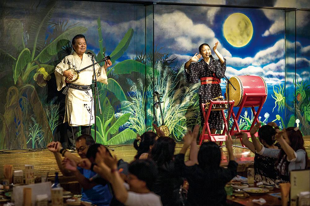 沖縄家庭料理と泡盛、三線ライブを一度に楽しめる人気店。