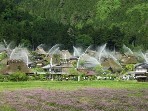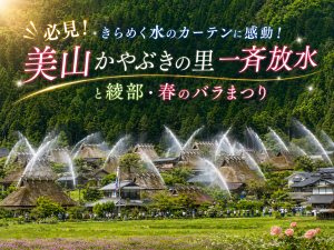 【ハピ旅特別企画】必見!きらめく水のカーテンに感動!美山かやぶきの里一斉放水と綾部・春のバラまつり【A】