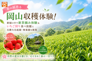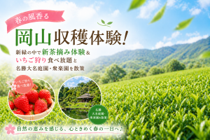 春の風香る岡山収穫体験!新緑の中で新茶摘み体験&いちご狩り食べ放題と名勝大名庭園・衆楽園を散策