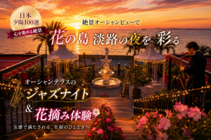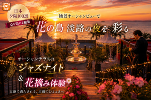 【ハピ旅】心を染める日本夕陽100選!絶景オーシャンビューで花の島淡路の夜を彩るオーシャンテラスのジャズナイト&花摘み体験